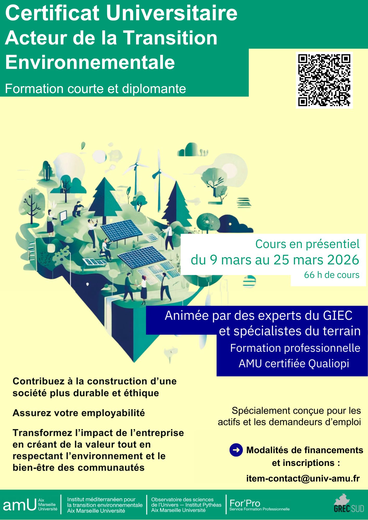 INSCRIPTIONS OUVERTES ! Le Certificat Universitaire (C.U) « Acteur de la Transition Environnementale » revient pour sa session de printemps 2026 à Aix-Marseille Université.